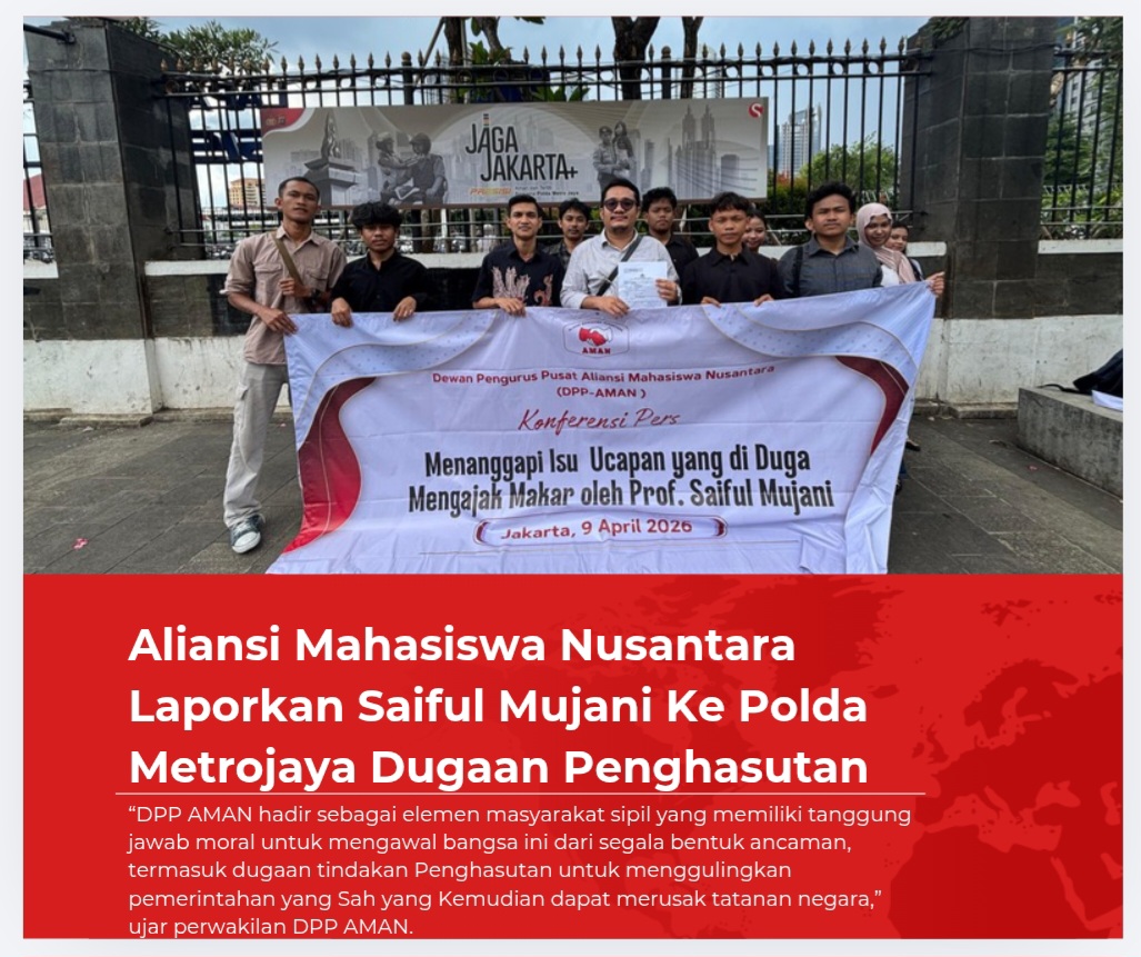 Jakarta,SCNews.co.id — Dewan Pimpinan Pusat Aliansi Mahasiswa Nusantara (DPP AMAN) baru selesai melaporkan Saiful Mujani ke Polda Metro Jaya pada hari, Jum’at (10/4/2026) terkait dugaan tindakan yang diduga mengara kepada Penghasutan di Depan Umum.