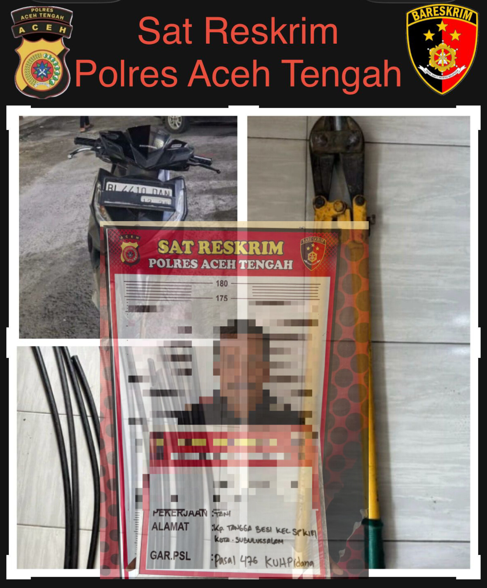Dari tangan terduga pelaku, polisi turut mengamankan sejumlah barang bukti berupa satu unit gunting potong besi warna kuning, satu unit sepeda motor Honda Vario Techno warna hitam nomor polisi BL 4410 DAN, serta 15 batang kabel A3CS warna hitam yang telah dipotong.