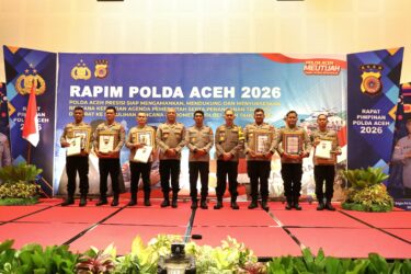 Penyerahan penghargaan berlangsung dalam forum Rapim yang digelar di Hotel The Pade, Selasa (24/2/2026), disaksikan pejabat utama Polda Aceh serta para Kapolres dan Kapolsek jajaran.