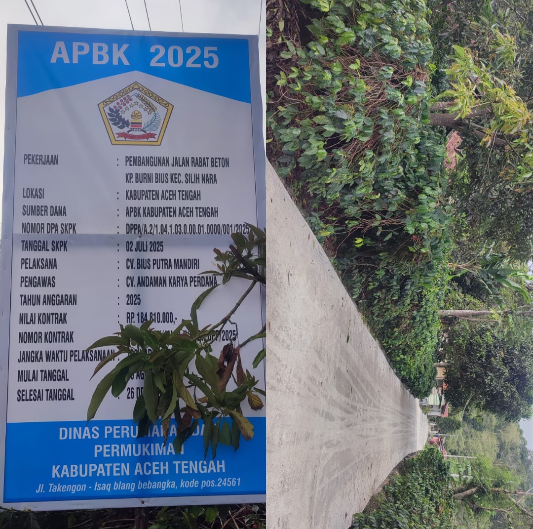 Informasi yang sempat terbaca pada papan tersebut antara lain menyebutkan bahwa proyek itu merupakan pembangunan rabat beton Kampung Burni Bius dengan sumber dana dari APBK Aceh Tengah. Berdasarkan papan informasi yang sempat terlihat, proyek dilaksanakan oleh CV Bius Putra Mandiri, dengan pengawasan dari CV Andaman Karya Perdana, dan memiliki nilai kontrak sebesar Rp184.810.000. Pekerjaan dimulai pada 28 Agustus 2025 dan dijadwalkan selesai pada 25 Desember 2025.