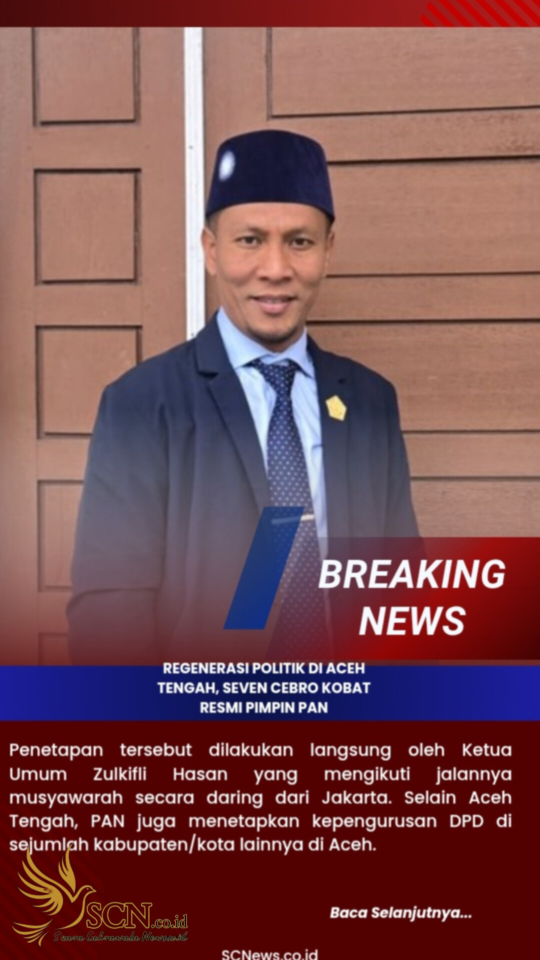 Takengon,SCNews.co.id – 16 Februari 2926.Penetapan Seven Cebro Kobat sebagai Ketua DPD Partai Amanat Nasional (PAN) Kabupaten Aceh Tengah mendapat perhatian dari berbagai kalangan, termasuk organisasi kepemudaan dan kemahasiswaan. Sosok muda yang dinilai energik dan progresif itu resmi memimpin DPD PAN Aceh Tengah melalui musyawarah daerah yang digelar di Kantor DPW PAN Aceh, Lueng Bata, Banda Aceh, Minggu (15/2/2026).