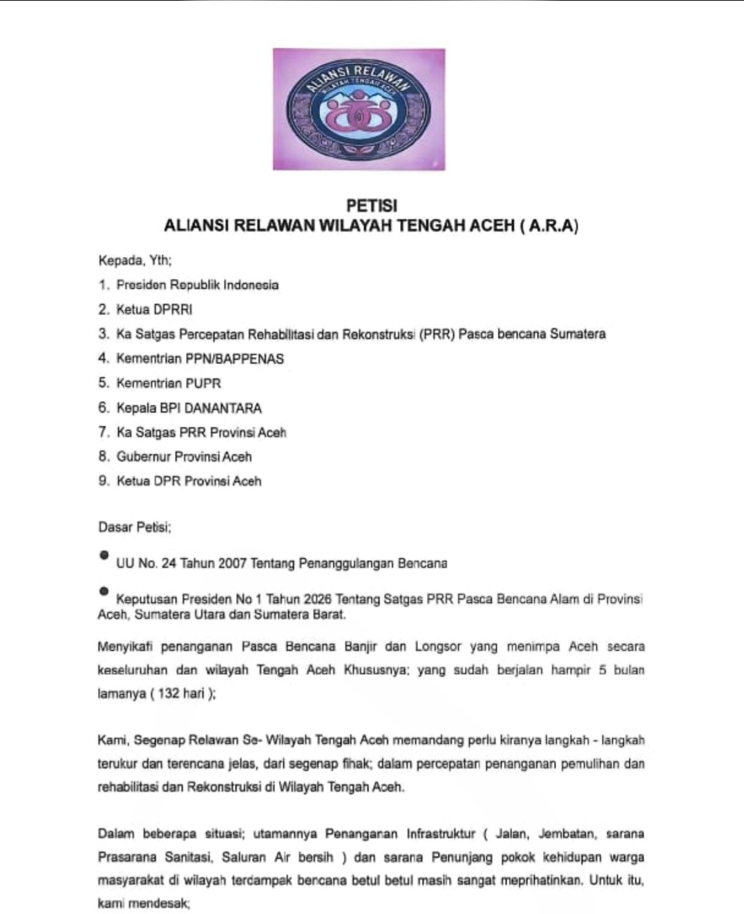 Petisi ini diharapkan menjadi perhatian serius pemerintah pusat maupun daerah, mengingat masih banyak warga terdampak di wilayah Aceh Tengah yang menanti kepastian pemulihan kehidupan mereka.