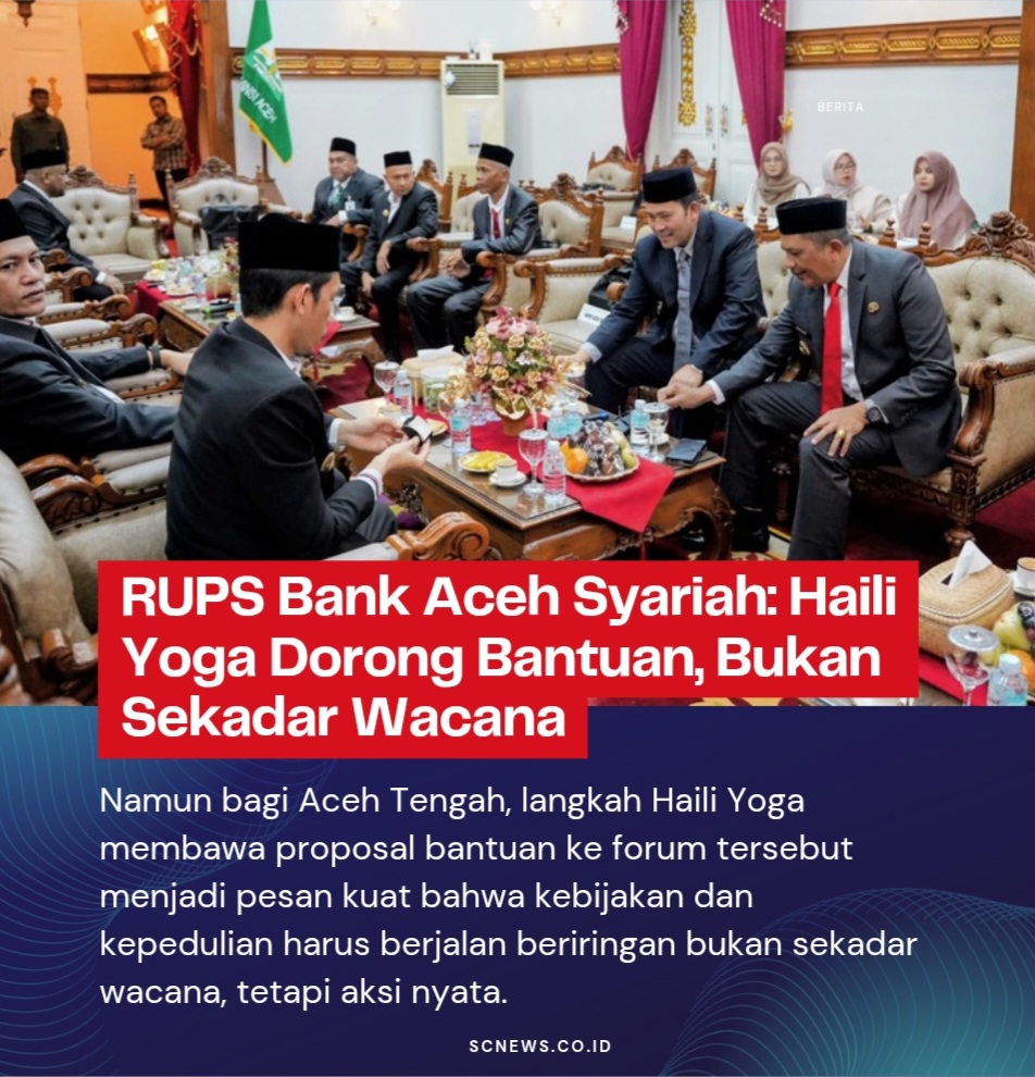 Banda Aceh, SCNews.co.id – Bupati Aceh Tengah, Haili Yoga, tak hanya hadir sebagai pemegang saham dalam Rapat Umum Pemegang Saham (RUPS) Tahun Buku 2025 Bank Aceh Syariah, tetapi juga membawa misi kemanusiaan. Forum yang digelar di Pendopo Gubernur Aceh, Senin (13/04/2026), dimanfaatkannya untuk mendorong bantuan nyata bagi korban kebakaran di Aceh Tengah.