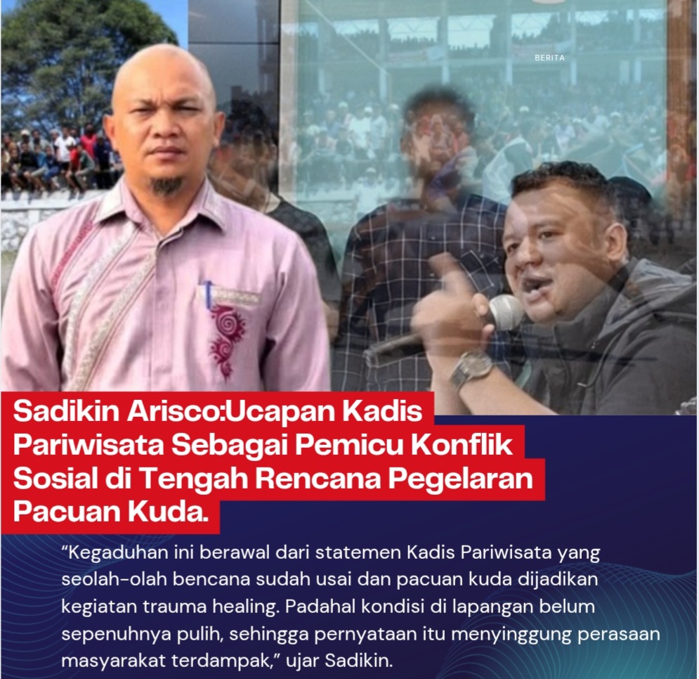 “Kegaduhan ini berawal dari statemen Kadis Pariwisata yang seolah-olah bencana sudah usai dan pacuan kuda dijadikan kegiatan trauma healing. Padahal kondisi di lapangan belum sepenuhnya pulih, sehingga pernyataan itu menyinggung perasaan masyarakat terdampak,” ujar Sadikin.