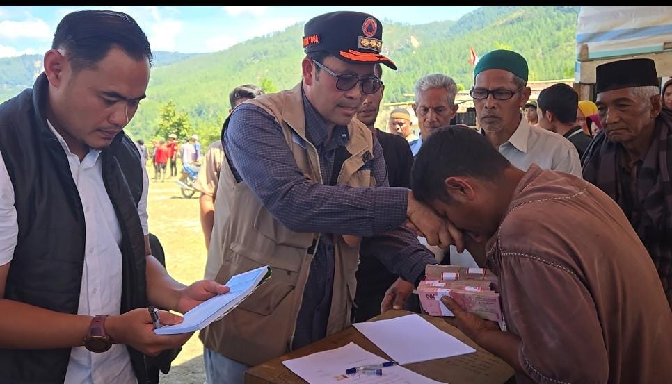 Di hadapan warga, Bupati Aceh Tengah, Drs. Haili Yoga, M.Si, secara langsung membayarkan ganti rugi tanah yang akan menjadi lokasi relokasi permanen bagi masyarakat Kutereje, kampung yang sebelumnya luluh lantak diterjang banjir bandang dan longsor. Sebuah momen sederhana, namun sarat makna: negara benar-benar hadir.