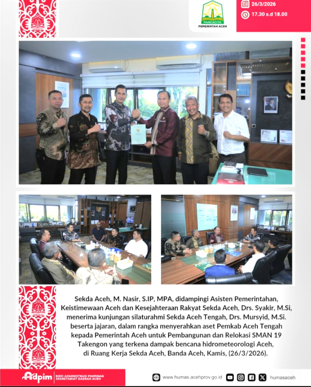 Banda Aceh,SCNews.co.id – Sekretaris Daerah (Sekda) Aceh, M. Nasir, menerima kunjungan silaturahmi Sekda Aceh Tengah, Mursyid, di ruang kerjanya, Kamis (26/3/2026). Pertemuan tersebut berlangsung dalam suasana hangat dan penuh koordinasi antar pemerintah daerah.