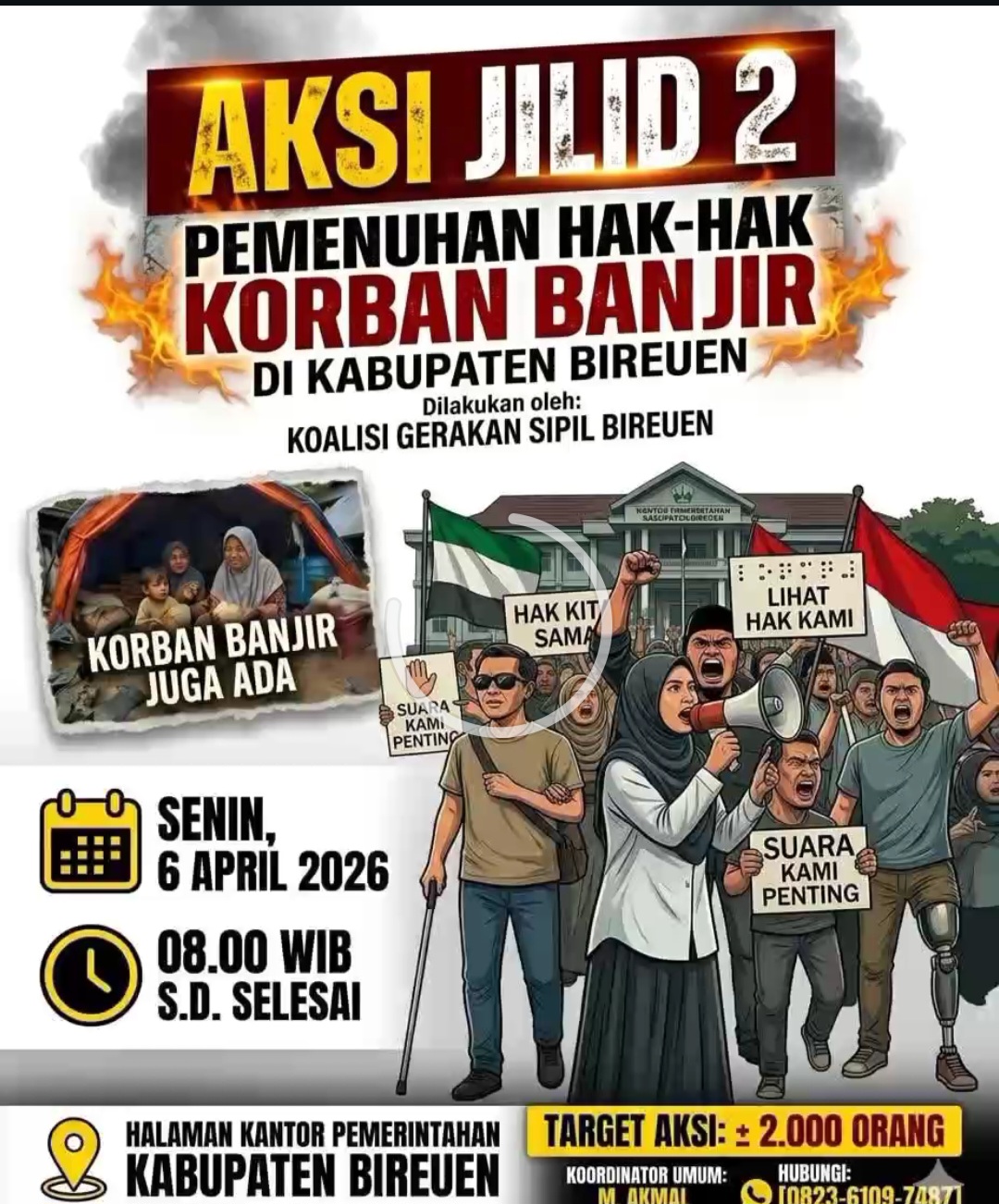 Mari hadir, mari bersuara, dan mari kawal bersama pemenuhan hak-hak korban banjir di Bireuen.